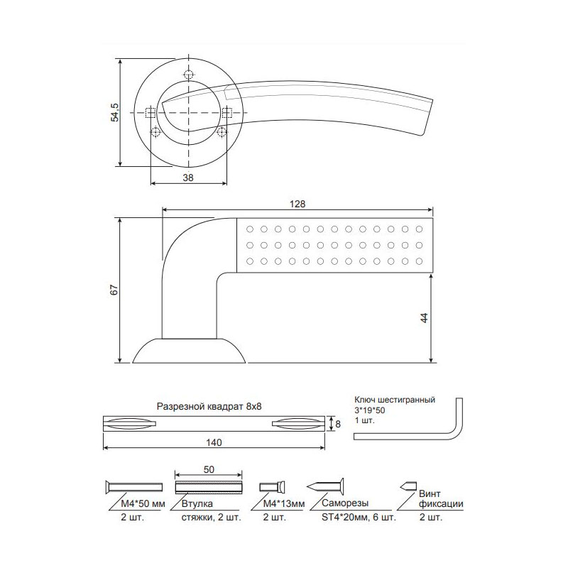 Прочная и надёжная система крепления ручки на установочной розетке предотвратит образование люфтов, значительно продлит срок службы дверной фурнитуры. Стяжные винты в комплекте обеспечивают жесткое крепление на полотне двери. В комплект дверных ручек также входят: стяжные винты, соединительный квадрат, саморезы, фиксирующие винты, ключ-шестигранник.
